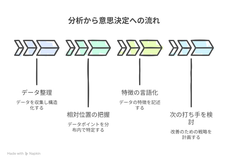 分析結果は、グラフや分布図を用いてわかりやすく可視化しました。数値そのものを並べるのではなく、全体分布の中でどこに位置するかを示すことで、専門知識がなくても理解しやすい形を目指しました。これにより、関係者間で評価の前提を揃えやすくなり、次の検討ステップに向けた建設的な議論を促しました。