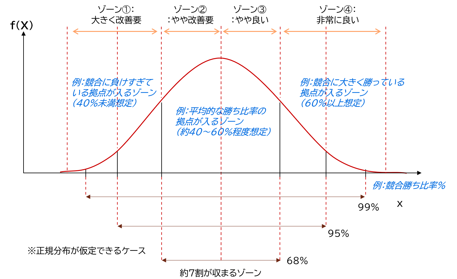 まず、実績、競合状況、開拓余地、将来性といった複数の観点を整理し、それぞれを定量的に比較できる形に整えました。その上で、正規分布の考え方を用い、全体の中での相対的な位置づけを把握できる評価軸を設計しました。平均的なゾーン、改善余地のあるゾーン、優位性のあるゾーンといった形で整理することで、各エリアごとの特徴や位置付けを直感的に理解できるよう工夫しています。