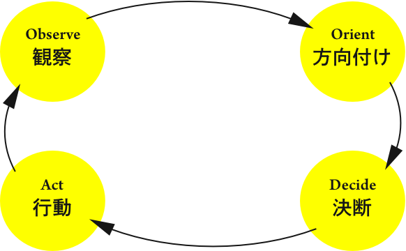 Observe(観察)、Orient(方向付け)、Decide(決断)、Act(行動)の4つの頭文字をとったもので、問題を解決するまでこの4つのループを何度も繰り返し行うものであるため、OODAループと呼ばれています。